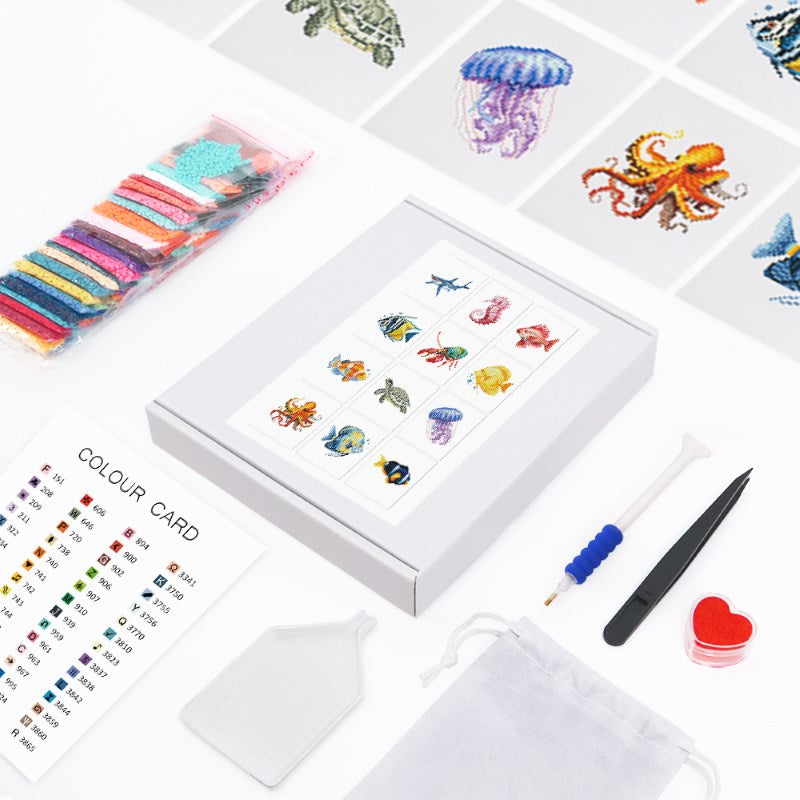 Gi interiøret ditt farge og liv med denne vakre samlingen av 12 mini Diamond Paintings- fiskesett. Hvert design viser en unik fisk, full av livlige farger og detaljerte mønstre. Perfekt for å lyse opp rommet ditt eller gi som gave til en undervannselsker. Bli inspirert og gjør hvert maleri til et personlig mesterverk.