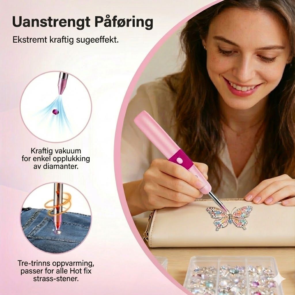 Pennen kan også brukes som elektrisk diamond painting-penn. Når varmefunksjonen er slått av, brukes pennen kun med vakuumfunksjon, slik at diamond painting-steiner enkelt kan plukkes opp og plasseres presist uten voks.