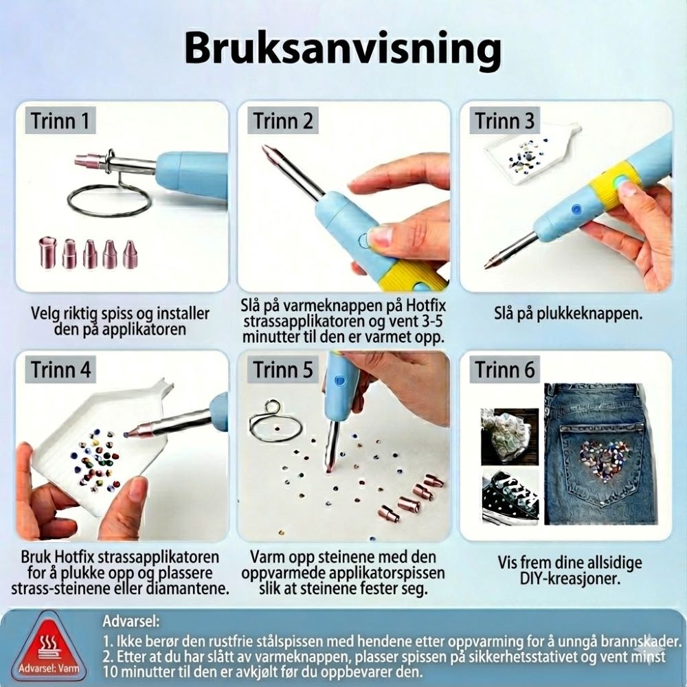 Med denne pennen fester du enkelt hotfix-strasssteiner på klær, tilbehør og DIY-prosjekter. Pennen bruker varme, slik at limlaget på undersiden av strasssteinene smelter og fester seg godt til materialet. Perfekt for å personliggjøre klær, vesker, sko og kreative hobbyprosjekter.