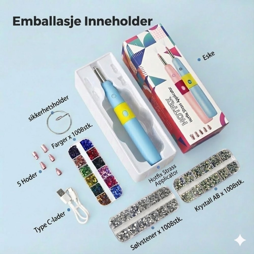 • 5 utskiftbare spisser for ulike størrelser strasssteiner