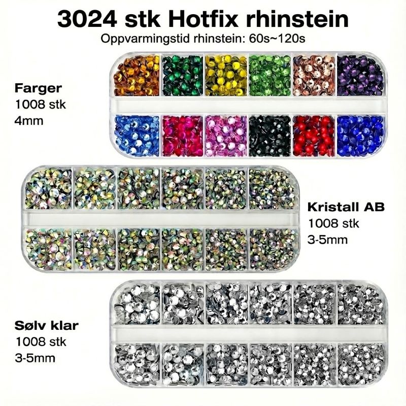 • 1008 sølvfargede hotfix-strasssteiner (3–5 mm)